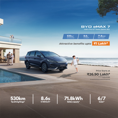 The BYD eMAX 7 price ranges between Rs. 26.90 – Rs. 29.90 lakhs*(ex-showroom). All its variants with 4 exclusive colours are available at PPS BYD showrooms in Bengaluru, Mahadevapura, Vizag and Vijayawada. Book a test drive today to witness the pinnacle of electric mobility and experience a seamless blend of luxury and innovation.